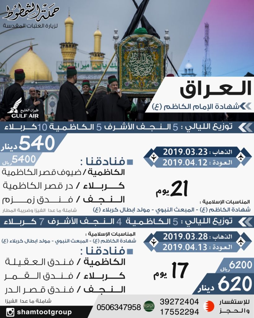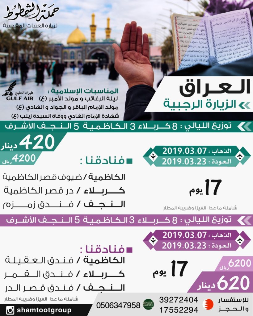 العراق في شهر رجب – والعراق في شهادة الامام الكاظم (ع) 2019 abbas shamtoot 16 فبراير، 2019 الرحلات, العراق 2,477 زيارة شاركها Facebook Twitter Stumbleupon LinkedIn Pinterest